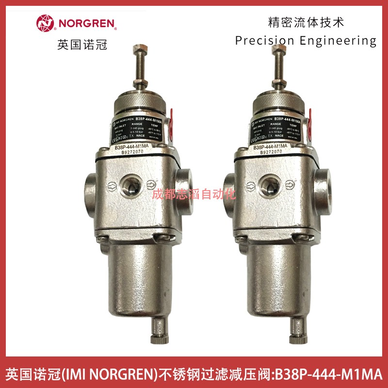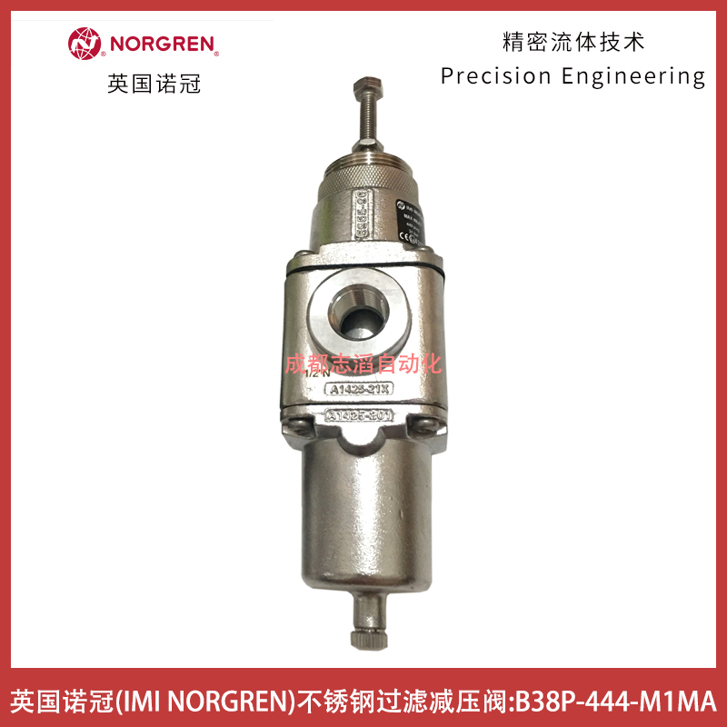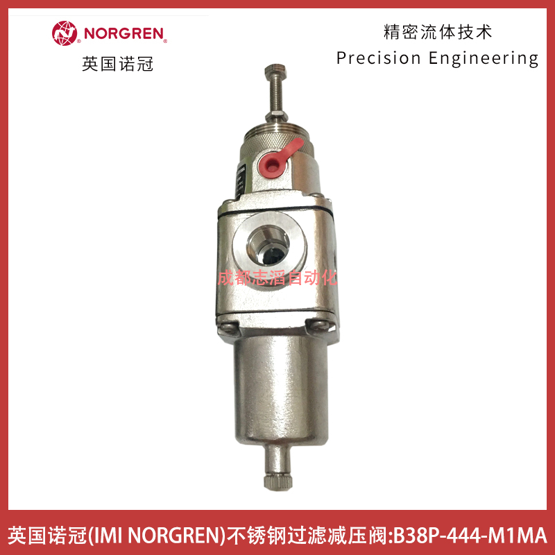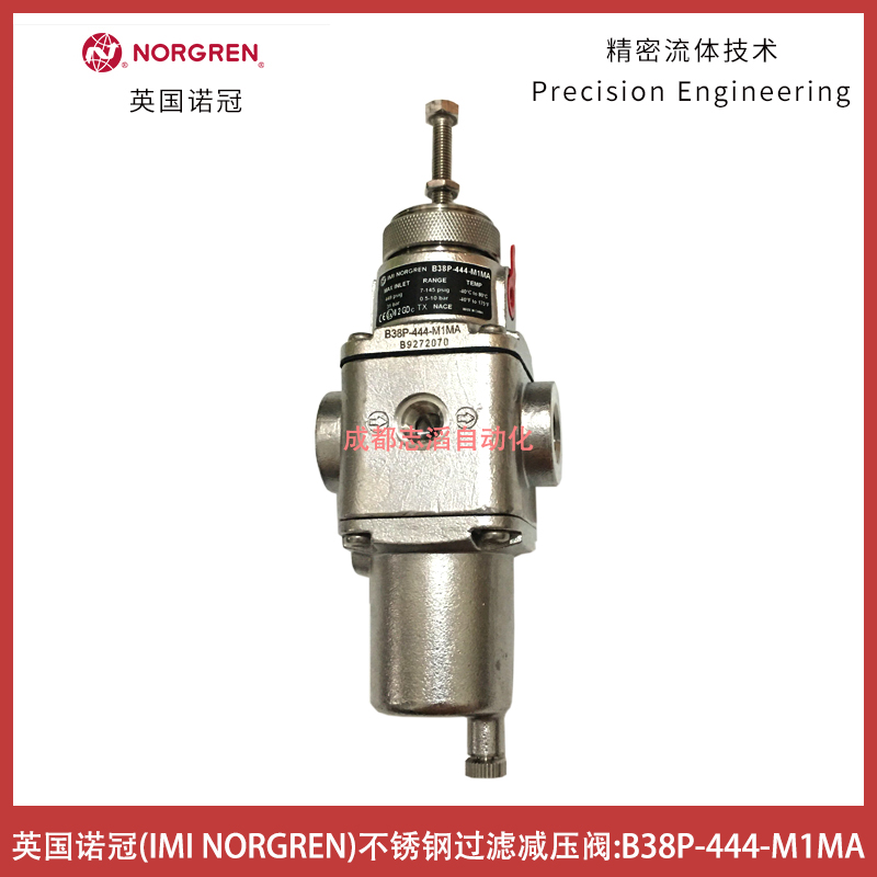 B38P-444-M1MA英国诺冠(IMI NORGREN)过滤调压阀技术参数简介:接口尺寸1/2NPT、出口压力0.5-10bar、过滤精度为5um、流量为40升/min、排水方式手动、重量为2.41kg、材料壳体,滤杯,上盖,滤芯以及调节螺钉为316不锈钢、密封为FKM或NBR、环境及流体温度范围为-20到80摄氏度、进口压力可达17bar、产地为中国!