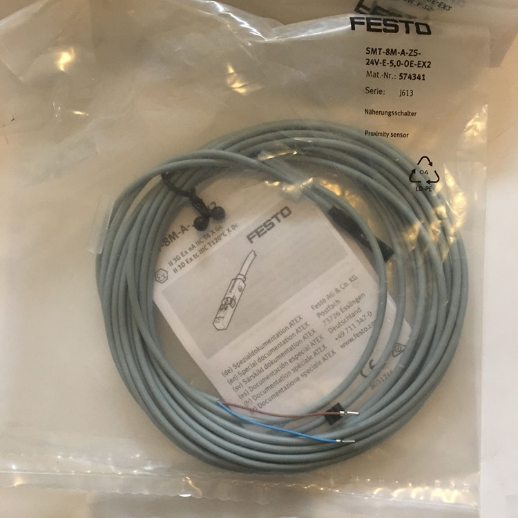 SMT-8M-A-ZS-24V-E-5-OE-EX2德国费斯托FESTO气缸接近开关简介:订货号为574341、功能SMT-8M适合T槽安装的接近开关电子式、系列为A短型、开关输出为ZS PNP常开触点2线、额定负载电源为24VDC、导线特性为E可以配合拖动链一起使用/可用于机器人、线路长度为5.0m、管线名称为带标签支架、接口形式为OE开放式末端!