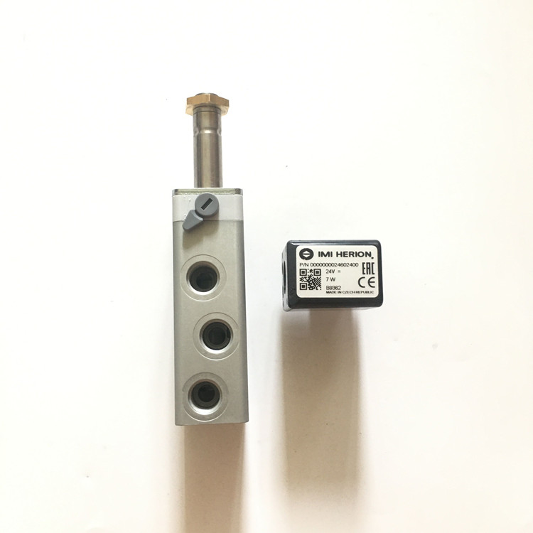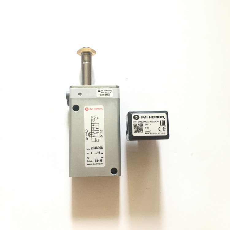 2636008.0246.024.00德国海隆(IMI HRION)电磁阀技术参数简介:接口尺寸G1/4、工作压力范围1-10bar、流量为1200l/min、切换时间35ms、阀体重量0.55kg、先导型号为9933126(产地为德国)、阀体产地为捷克、配海隆普通线圈0246(功耗为8W、电流为331ma、范固化等级IP65带电气插头、环境流体温-25到80摄氏度、电气接口DIN EN175301-803A型、线圈重量为0.15kg、产地为捷克)!