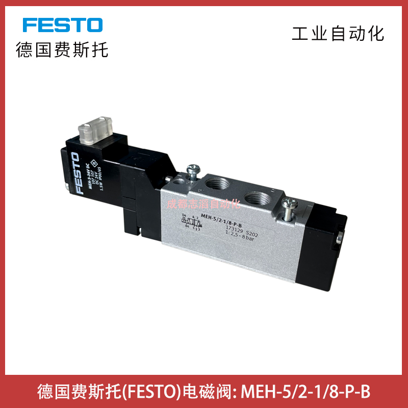 MEH-5/2-1/8-P-B德国费斯托电磁阀FESTO通用型方向控制阀技术参数简介:阀功能两位五通,单稳态、搭接正重叠、驱动方式电控、宽度17.8mm、标准标称流量600l/min、工作气口G1/8、工作电压DC24V、工作压力2.5-8bar、设计活塞闸阀、复位类型弹簧复位、防护等级IP65、认证c UL us - 认证 (OL)、公称通径5mm、网格尺寸18mm、短型号代码MEH、排气功能带节流选项、密封原理软密封、安装位置可选、手控装置通过附件锁定、先导类型先导驱动、先导气源内先导、流向不可逆、符号00991035、先导压力2.5-8bar、b 值0.36、C 值2.55 l/sbar、关闭时间28ms、打开时间10ms、持续通电率百分之百、线圈的特性参数DC24V,1.5W、工作介质压缩空气,符合 ISO 8573-1:2010 [7:4:4]、工作和先导介质说明可用润滑介质工作(之后须一直润滑介质工作)、抗振性运输应用测试,严重性等级 1,符合 FN 942017-4 和 EN 60068-2-6 标准、耐冲击性冲击测试,严重性等级 2,符合 FN 942017-5 和 EN 60068-2-27、耐腐蚀等级 CRC2 - 中等耐腐蚀能力、储存温度-20到40摄氏度、介质温度/环境温度-5到50摄氏度、声压级75 dB(A)、先导介质压缩空气,符合 ISO 8573-1:2010 [7:4:4]、产品重量105g、电气接口符合工业标准的 C 型插头,9.4 mm插头方形、安装方式在气路板、先导排气口 82/84底座、气接口,气口 1,35底座、气接口,气口 2,4为G1/8、材料说明RoHS 合规、密封件丁晴橡胶、外壳材料压铸铝