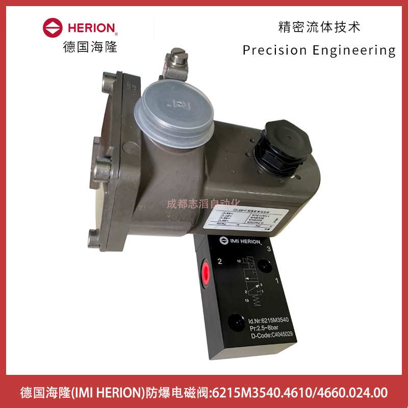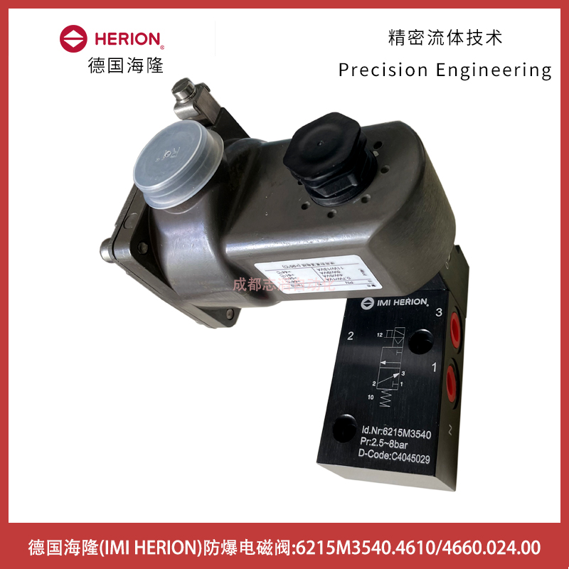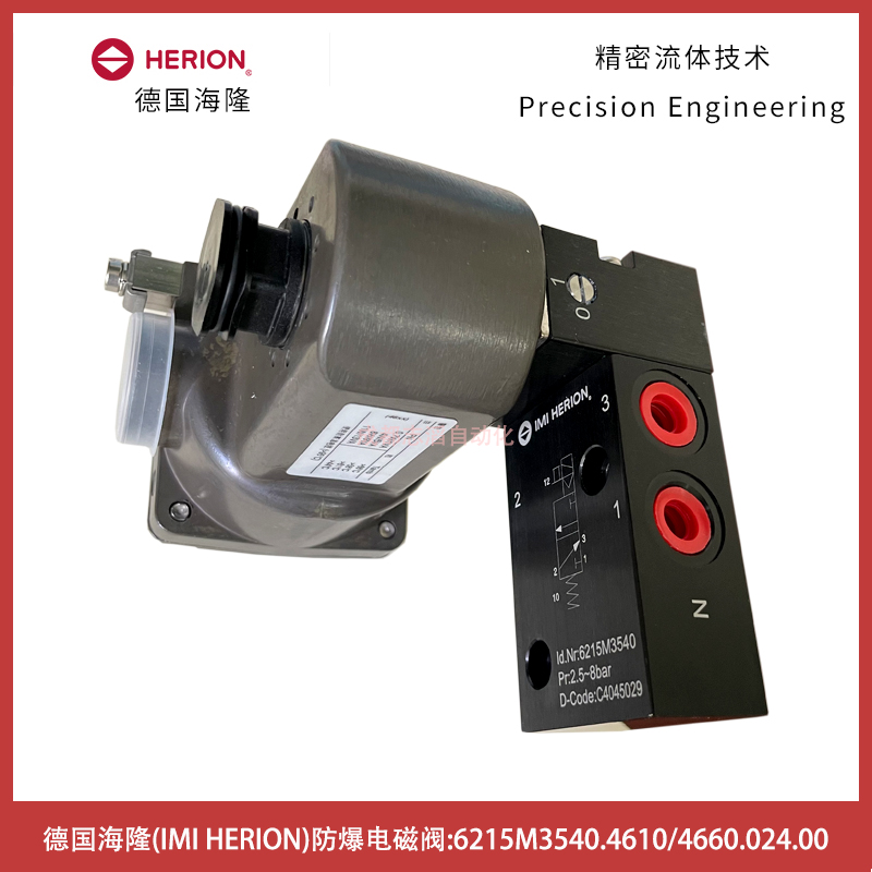 6215M3540.4610.024.00德国海隆(IMI HERION)隔爆电磁阀技术参数简介:功耗为M中等功耗(3.9W)、功能为3/2和5/2管接式、驱动方式/复位-弹簧复位、阀体材料阳极氧化铝/NBR(温度范围在-40到60摄氏度)通径为6mm、流量为1200l/min、工作压力范围2.5-8bar、阀体重量为0.392kg、阀体产地为中国、接口尺寸为NPT1/4、手动控制为1/4圈旋转手动控制、配海隆隔爆线圈4610(技术参数:功耗3.9W、额定电流162MA、防护等级IP66带电气接头、防爆ATEX类别II2 G Ex D mb IIC T4/T6 Gb,II2 G Ex e mb IIC T4/T6 Gb , II2 D Ex tb IIIC T13摄氏度Db、环境及流体温度T4(-40到80摄氏度)T6(-40到55摄氏度),-40到80摄氏度、电气接口1/2NPT、线圈重量0.8kg、产地为接口)!应用在石化行业阀门控制!