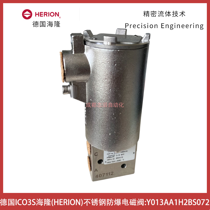 Y013AA1H2BS072德国海隆HERION不锈钢防爆电磁阀-埃迈诺冠IMI技术优势:ATEX等级EXD、功能2位3通、操作方式自动、接口尺寸NPT1/4、底座密封材料丁青橡胶NBR、电缆西安导入接口1/2NPT(F)、电压24VDC、zui大进口压力123bar、介质液体和空气、流量Cv=0.6USgpm、Kv值=8.64l/min、温度范围介质(zui低/zui高-55℃/90℃),环境(zui低/zui高-55℃/60℃)、阀尺寸1/4提升阀、重量2.5kg、产地德国