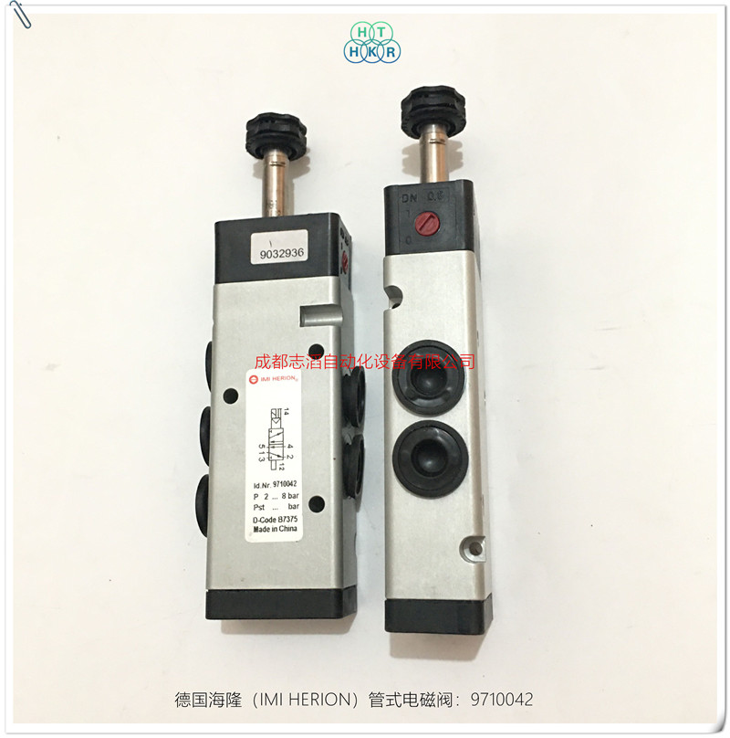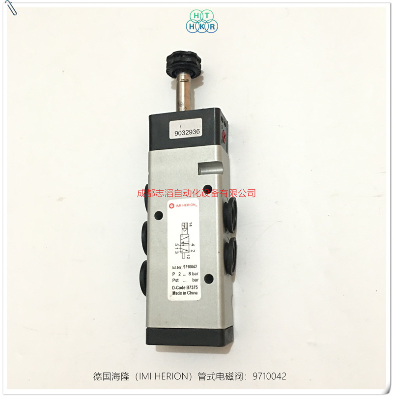 9710042德国海隆(herion)管式安装电磁阀技术参数:产地德国、接口尺寸1/4NPT、功能2位5通NC、驱动方式电磁线圈/弹簧、KV值为0.75立方米每小时、工作压力2-8bar、流量750l/min、阀体重量0.25kg