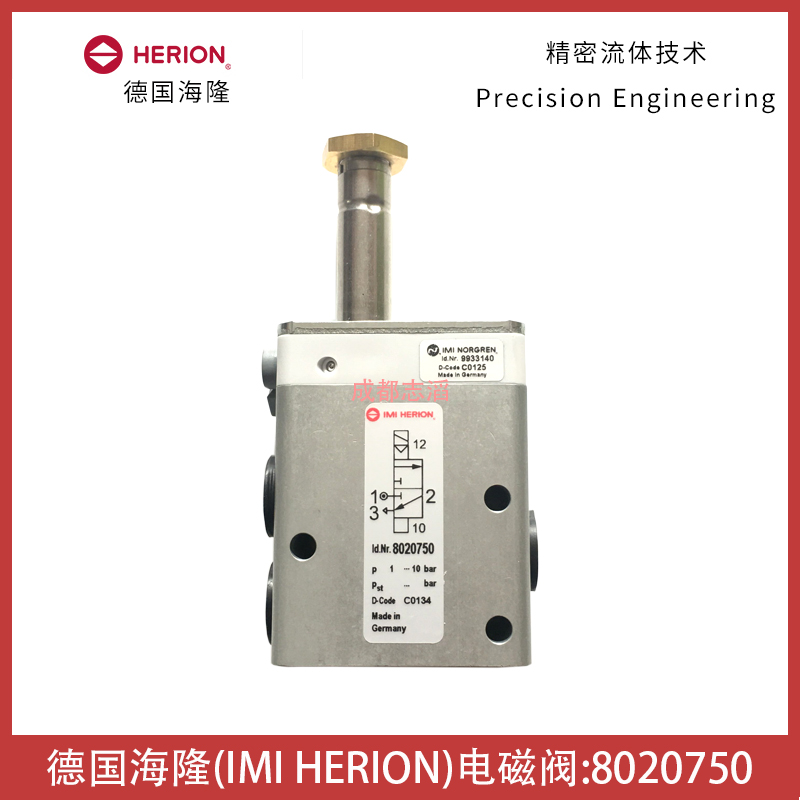 8020750德国海隆(IMI HERION)电磁阀技术参数:接口尺寸G1/4、NC、流量1200l/min、工作压力1-10bar、响应时间20ms、阀体重量0.4kg、产地为德国!