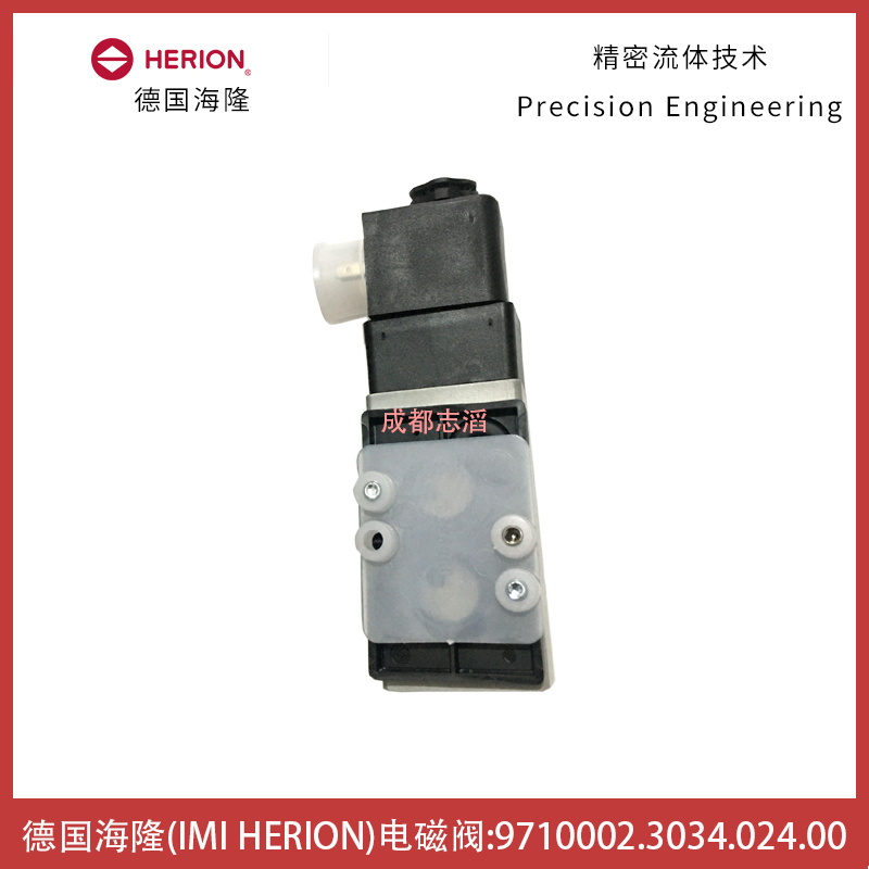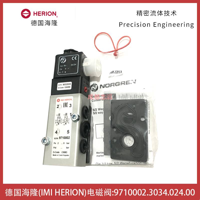 9710002.3034.024.00德国海隆(IMI HERION)NAMUR电磁阀技术参数简介:接口尺寸1为G1/4,3(5)为G1/8,2,4为法兰、功能NC、驱动方式电控/弹簧、KV值为0.75立方米/小时、阀体重量为0.25kg、产地为捷克、配海隆普通线圈3034(功率为0.7W、防护等级IP65(带电气插头)、环境及流体温度范围-40到50摄氏度、电气连接DIN43650A型、线圈重量为0.09kg、线圈电压为DC24V)!