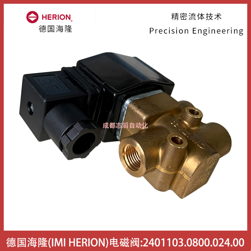 2401103.0800.024.00德国海隆电磁阀IMI HERION直动式-埃迈宝硕技术参数:管接式的阀、黄铜阀体、电磁线圈组A+B、接口尺寸为G1/4、工作压力0-10bar、材质阀座密封圈NBR、手动应急控制无、阀体重量0.65kg、配海隆HERION普通线圈0800(功率损耗16W、防护等级IP65(带电气插头)、环境及流体温度-25到60摄氏度,流体温度可达80摄氏度、电气连接DIN EN175301-803A型、线圈重量0.26、产地为捷克)线圈电压为24V直流!!