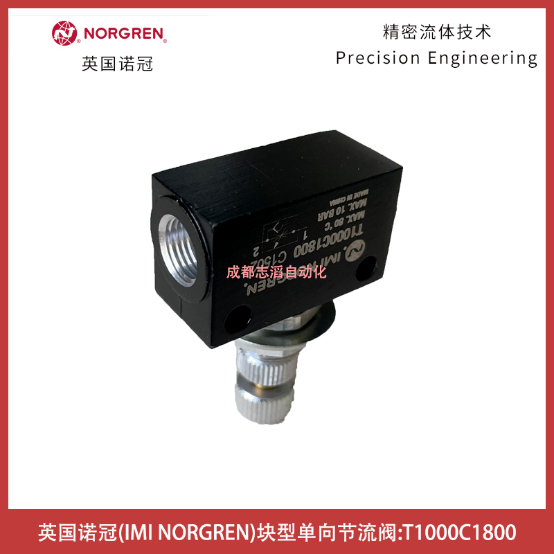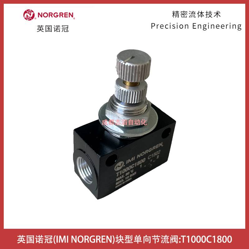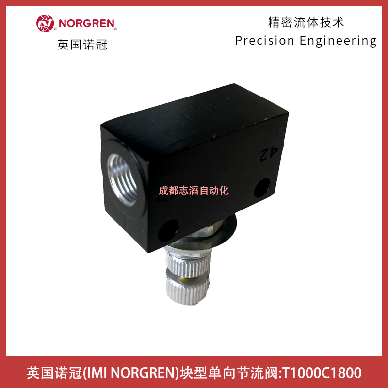 T10000C1800英国诺冠NORGREN块型单向节流阀技术参数简介:接口尺寸G1/8、zui大调节流量系数C*为0.28、Cv为0.07、自由流量系数C*为0.28、Cv为0.07、工作压力0.3bar、介质经过滤的润滑或者非润滑压缩空气、环境温度范围-20摄氏度到+80摄氏度、本体材料铝合金、密封件材料NBR、针阀芯和内部零件为黄铜、外部零件铝合金、紧凑,轻型,管式、大流量、适于面板/壁面安装、调节可锁定、当旋松螺丝时,针阀芯不会吹出、可调节旋钮位置